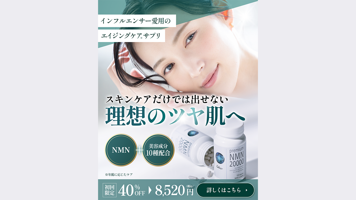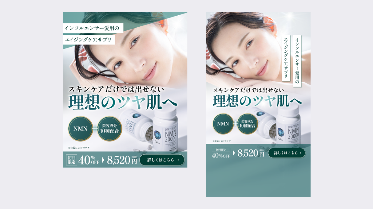 エイジングケア市場をターゲットにした高配合NMNサプリメントのディスプレイ広告。 「まるで美容液のような贅沢サプリ」というコピーで特別感を訴求し、 配合量・吸収率・美容成分という3つの要素から多角的に商品価値を伝えました。