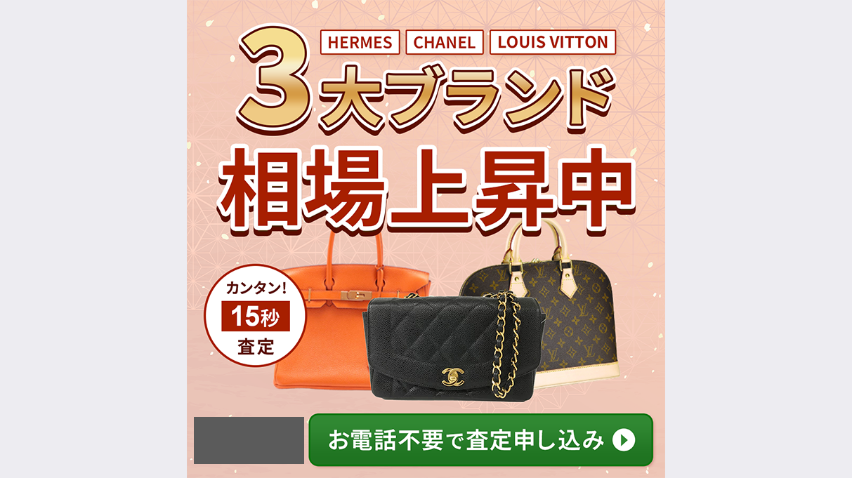 ブランドバッグの買取サービスを訴求するディスプレイ広告。 「3大ブランド相場上昇中」というコピーで今が売り時であることを端的に伝え、 具体的なブランド名と商品写真を組み合わせることで情報の信頼性を高めました。 さらに、「15秒査定」「電話不要」といった手軽さの訴求により申し込みへの心理的ハードルを下げています。