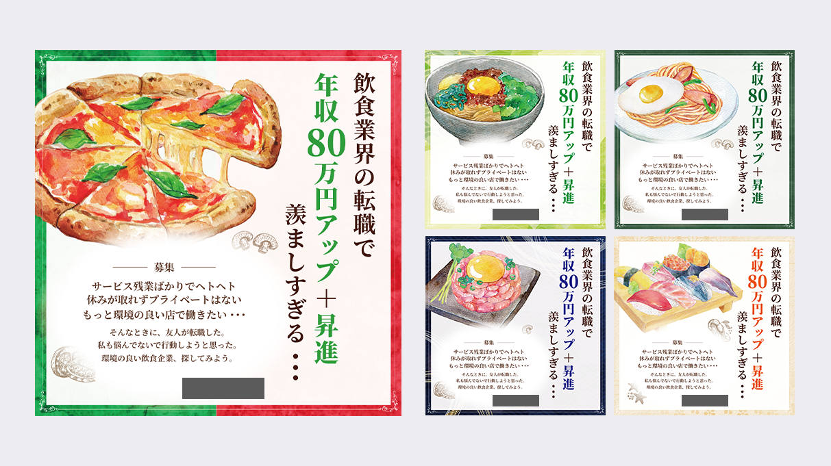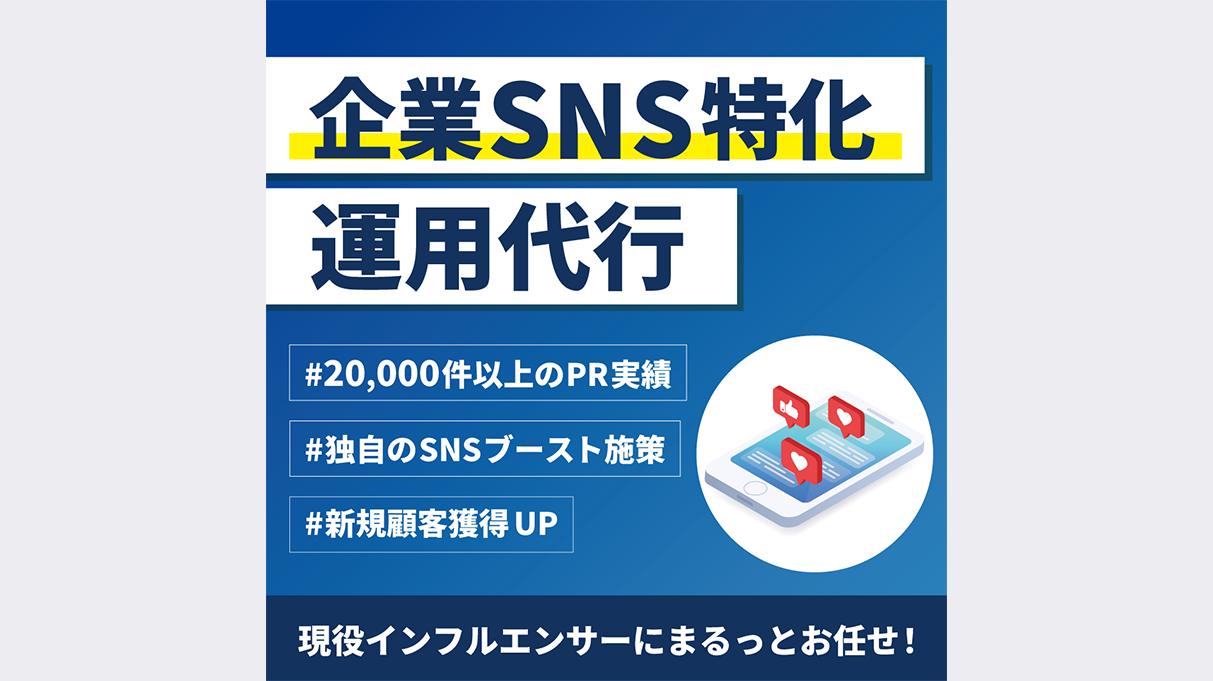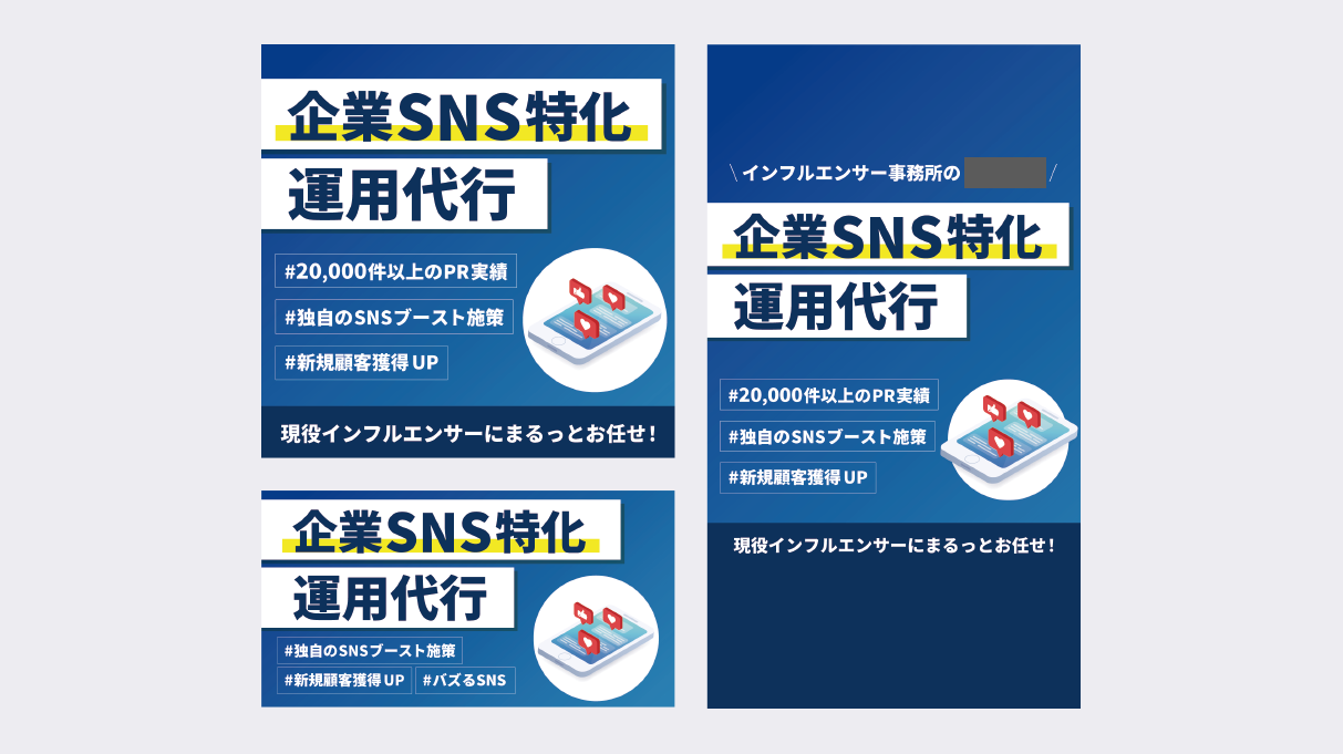 企業や店舗のSNS運用を代行し、認知拡大・集客・新規顧客獲得を 支援するサービスのディスプレイ広告。 「企業SNS特化」「運用代行」という明確な提供価値を端的に伝え、 信頼感と実績を訴求しました。
