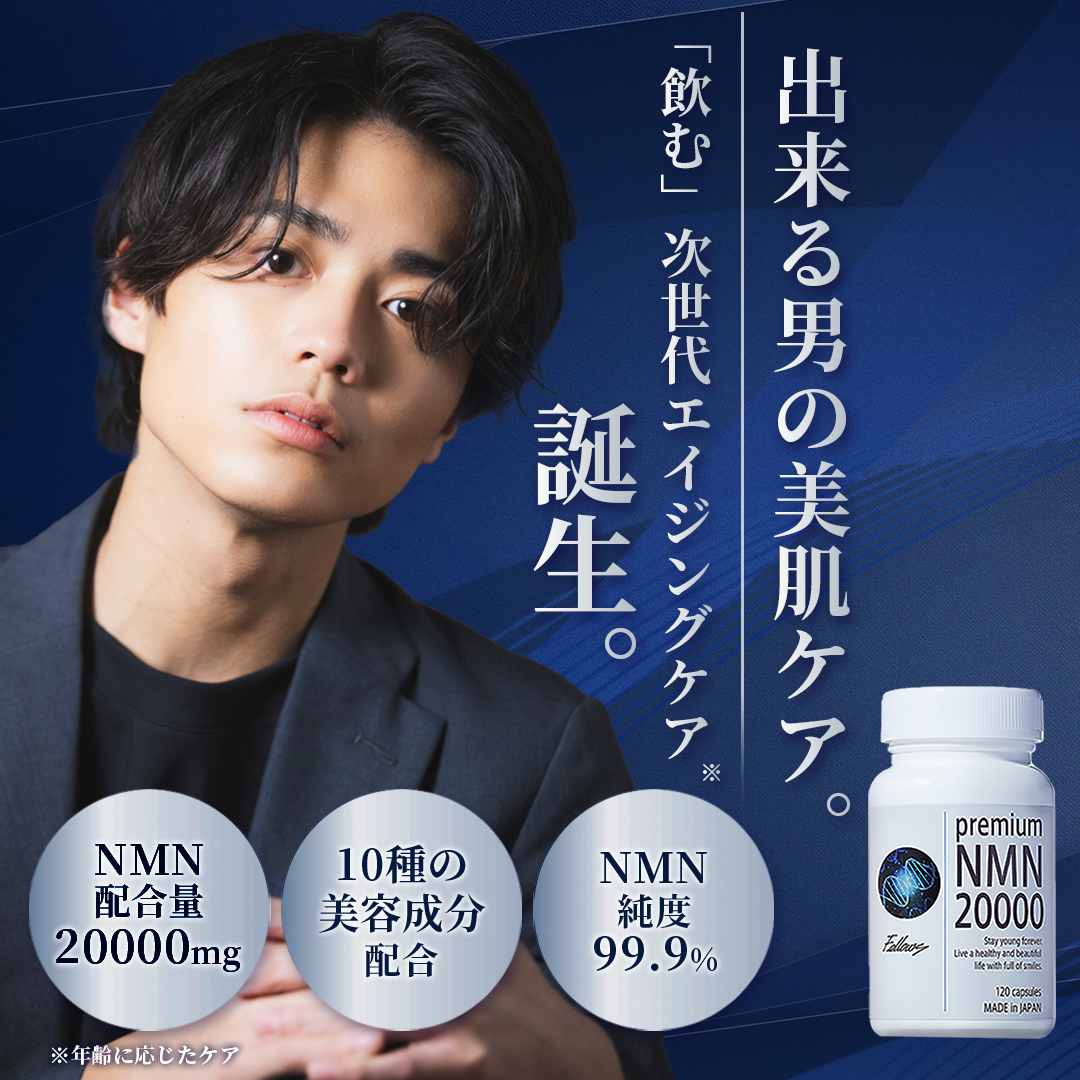 高配合NMNサプリメントのディスプレイ広告。 美容意識の高い男性をターゲットに、内側からのエイジングケアを訴求しました。 肌が綺麗な男性の画像と具体的な数値(配合量・純度・美容成分数)で製品の信頼性と優位性を表現しました。
