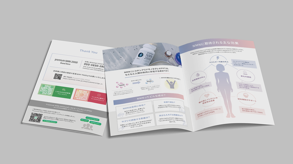 健康・美容系サプリメントの購入者向け同梱冊子として制作したパンフレット。 商品の理解促進と継続利用を目的に、初見でも内容が伝わる情報設計と、安心感・信頼感を重視したビジュアルを表現しました。
