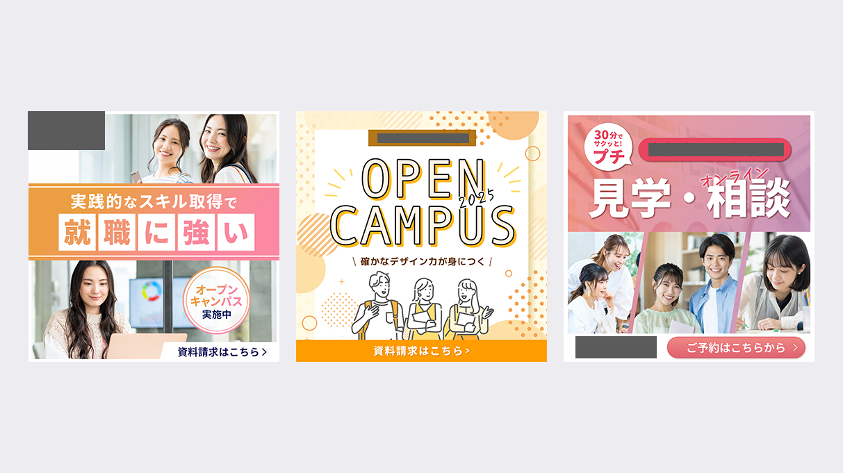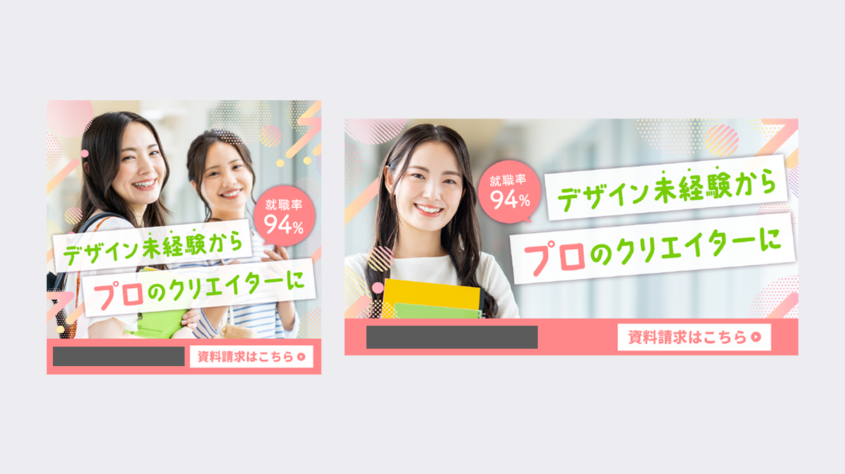 デザイン分野への進路を検討している学生を対象とした、 デザイン系専門学校の集客を目的としたディスプレイ広告。 プロのクリエイターを目指せる学習環境と就職率94%という実績を訴求し、 進学後の将来像が具体的にイメージできる構成で資料請求への導線強化を図りました。