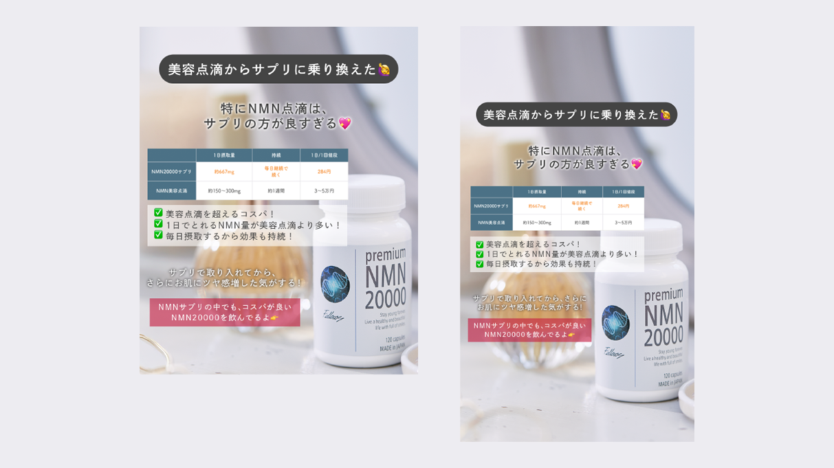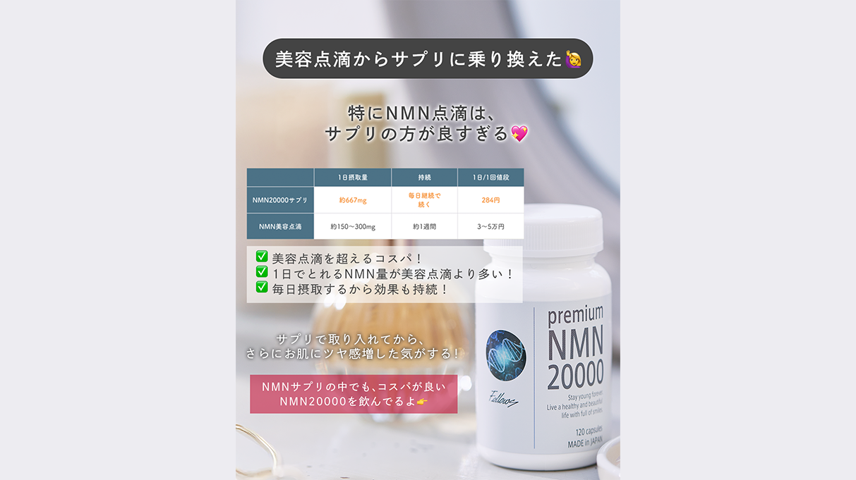 高額な美容点滴と比較して圧倒的なコストパフォーマンスの良さと、1日あたりのNMN配合量の多さを強調しながら、 毎日手軽に摂取できる継続しやすさをUGC風の親しみやすい表現で訴求しています。