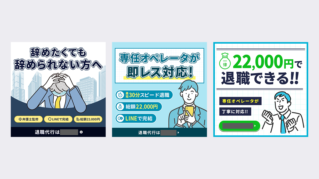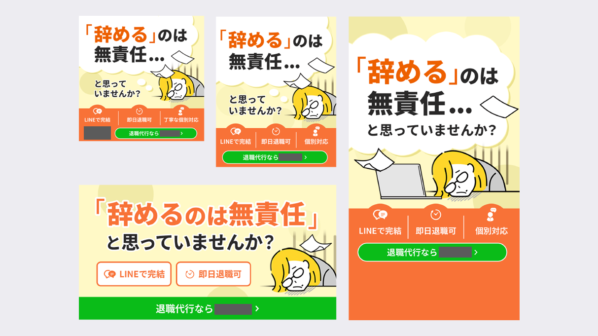 精神的・時間的な負担を感じながら退職を検討している社会人に 向けた退職代行サービスの認知・利用促進を目的としたディスプレイ広告。 「辞めたいと言い出せない」という心理的ハードルに寄り添い、 サービス利用の安心感と即効性を視覚的に伝える構成としました。