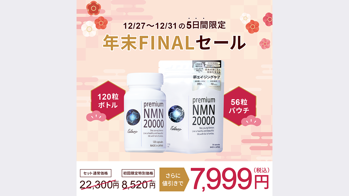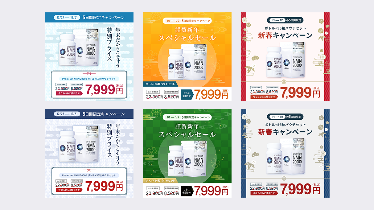 NMNサプリメントの年末セールキャンペーン用ディスプレイ広告。 過去のキャンペーンで「金額+商品を強調するデザイン」のCVが高かったことを踏まえ、 年末年始の季節感と期間限定の緊急性を加えたデザインを制作しました。 女性向けと男性向けの2パターンを、それぞれ異なるトンマナで展開しています。
