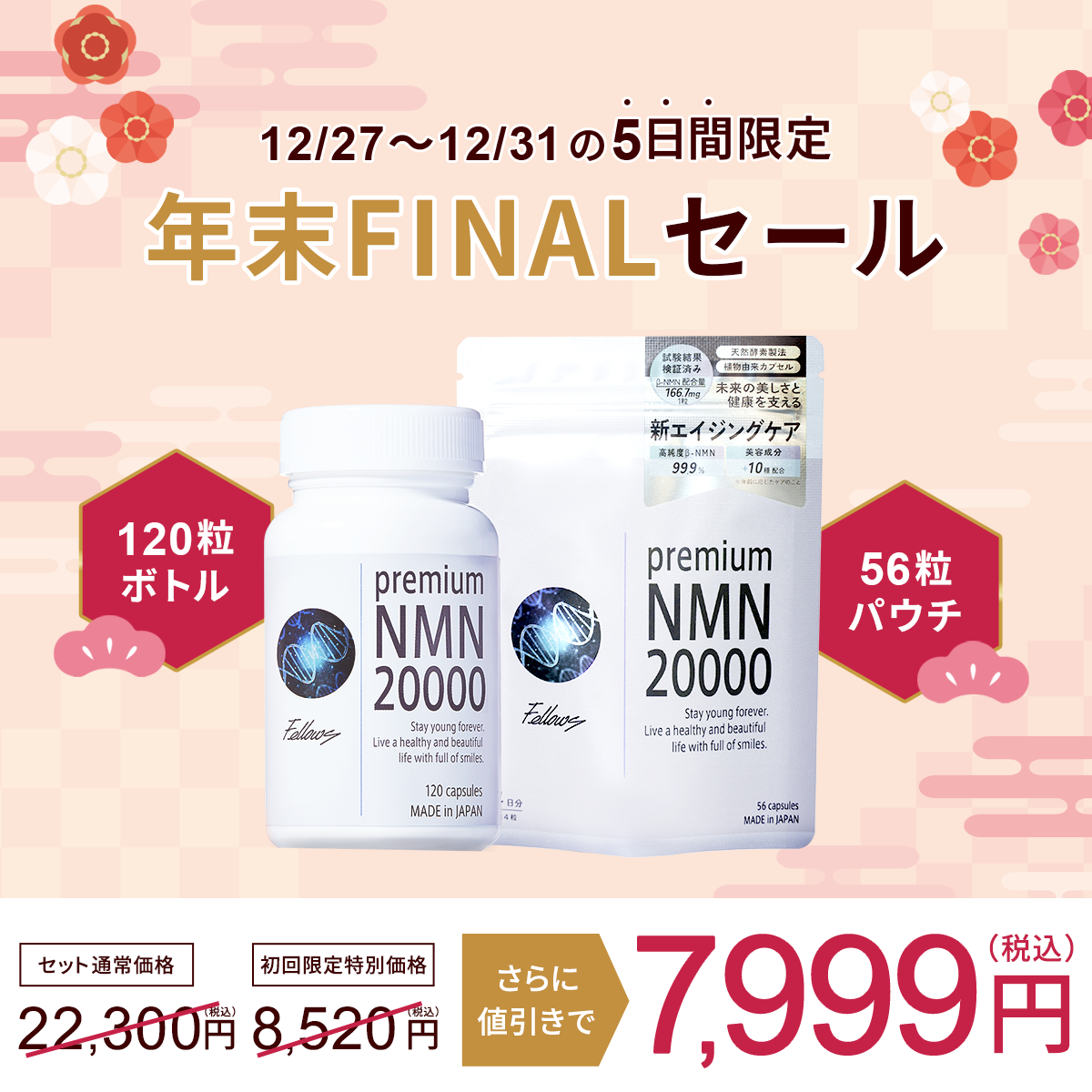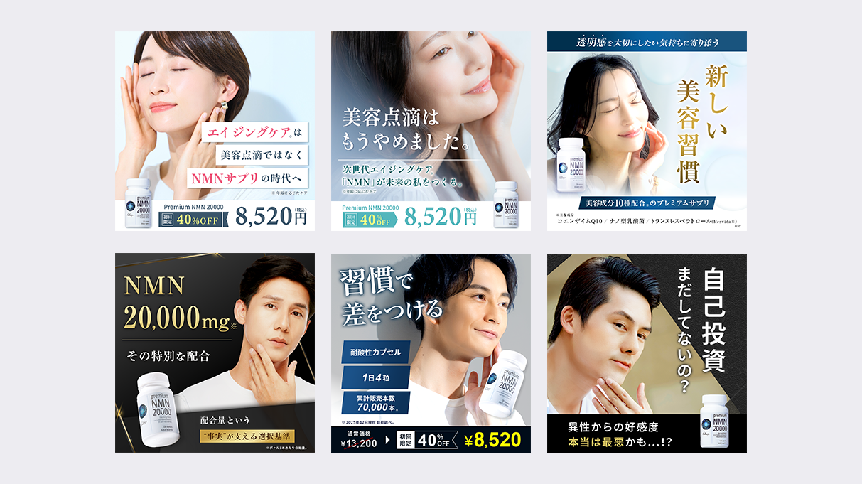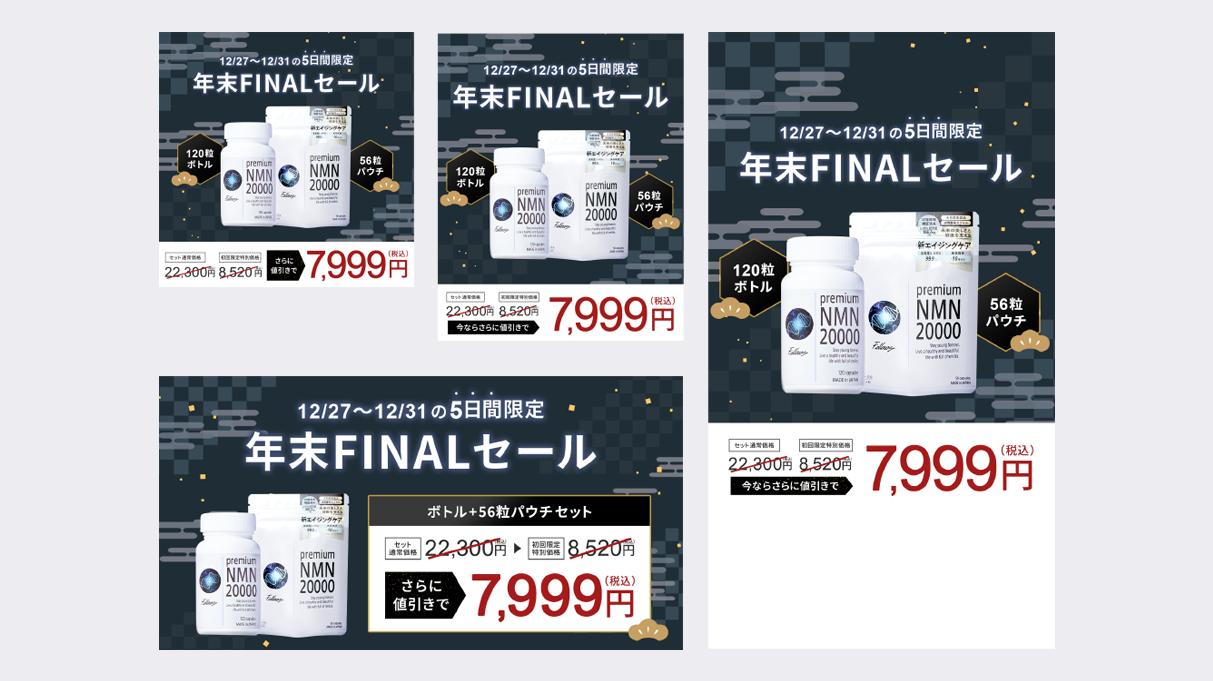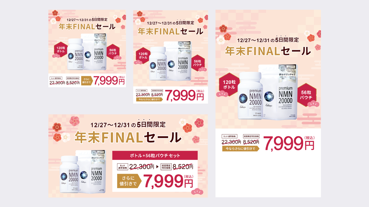 NMNサプリメントの年末セールキャンペーン用ディスプレイ広告。 過去のキャンペーンで「金額+商品を強調するデザイン」のCVが高かったことを踏まえ、 年末年始の季節感と期間限定の緊急性を加えたデザインを制作しました。 女性向けと男性向けの2パターンを、それぞれ異なるトンマナで展開しています。