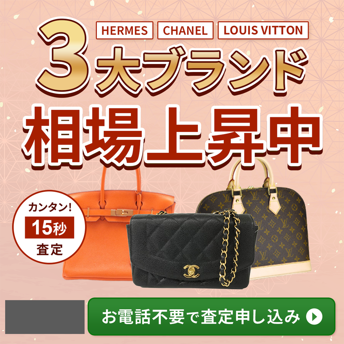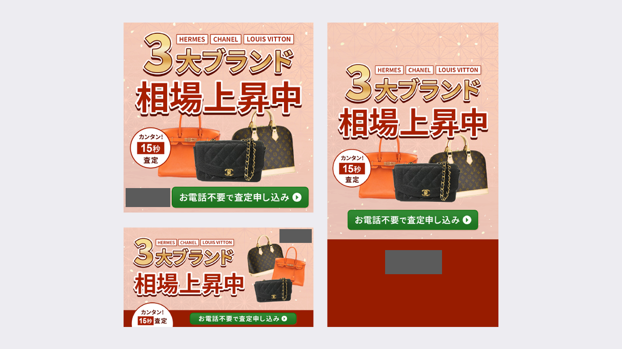 ブランドバッグの買取サービスを訴求するディスプレイ広告。 「3大ブランド相場上昇中」というコピーで今が売り時であることを端的に伝え、 具体的なブランド名と商品写真を組み合わせることで情報の信頼性を高めました。 さらに、「15秒査定」「電話不要」といった手軽さの訴求により申し込みへの心理的ハードルを下げています。
