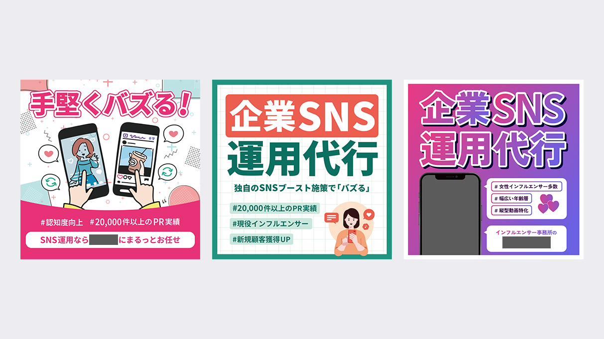 企業や店舗のSNS運用を代行し、認知拡大・集客・新規顧客獲得を 支援するサービスのディスプレイ広告。 「企業SNS特化」「運用代行」という明確な提供価値を端的に伝え、 信頼感と実績を訴求しました。