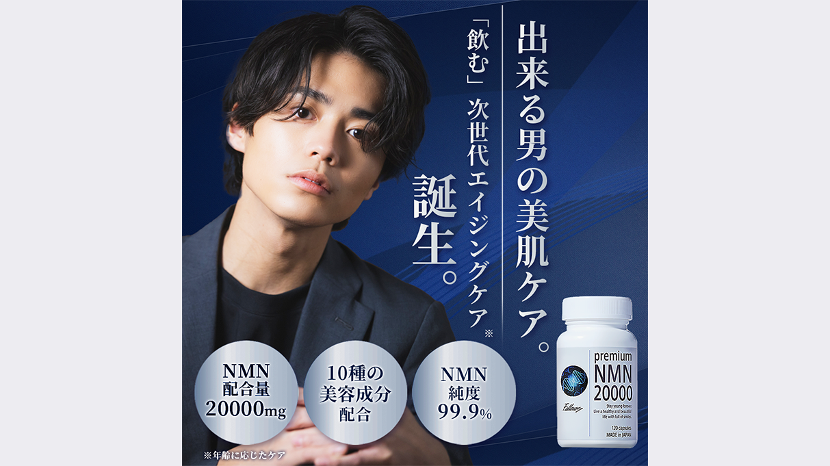 高配合NMNサプリメントのディスプレイ広告。 美容意識の高い男性をターゲットに、内側からのエイジングケアを訴求しました。 肌が綺麗な男性の画像と具体的な数値(配合量・純度・美容成分数)で製品の信頼性と優位性を表現しました。