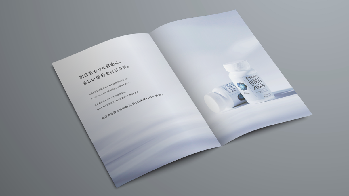 健康・美容系サプリメントの購入者向け同梱冊子として制作したパンフレット。 商品の理解促進と継続利用を目的に、初見でも内容が伝わる情報設計と、安心感・信頼感を重視したビジュアルを表現しました。