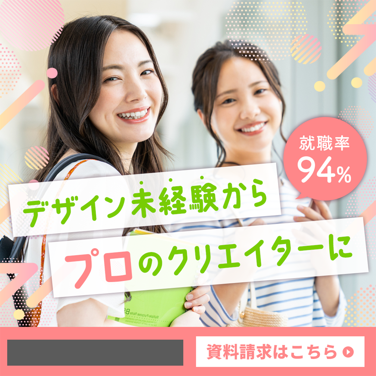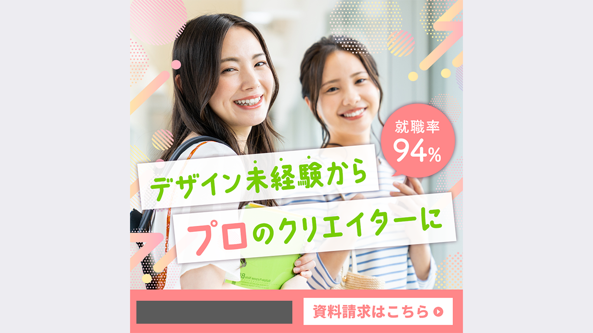 デザイン分野への進路を検討している学生を対象とした、 デザイン系専門学校の集客を目的としたディスプレイ広告。 プロのクリエイターを目指せる学習環境と就職率94%という実績を訴求し、 進学後の将来像が具体的にイメージできる構成で資料請求への導線強化を図りました。