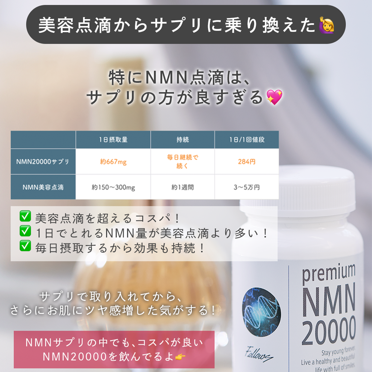 高額な美容点滴と比較して圧倒的なコストパフォーマンスの良さと、1日あたりのNMN配合量の多さを強調しながら、 毎日手軽に摂取できる継続しやすさをUGC風の親しみやすい表現で訴求しています。